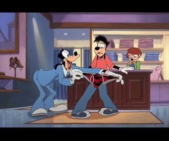 VIEW HIDDEN MICKEYThere are Hidden Mickeys in this scene from An Extremely Goofy Movie when Goofy is helping his son buy clothes.