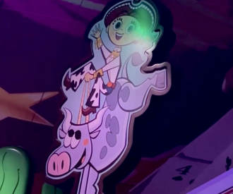 Check out this Hidden Mickey cleverly disguised as a spot on the side of the cow mural. It’s located in the Roundup Rodeo BBQ at Toy Story...